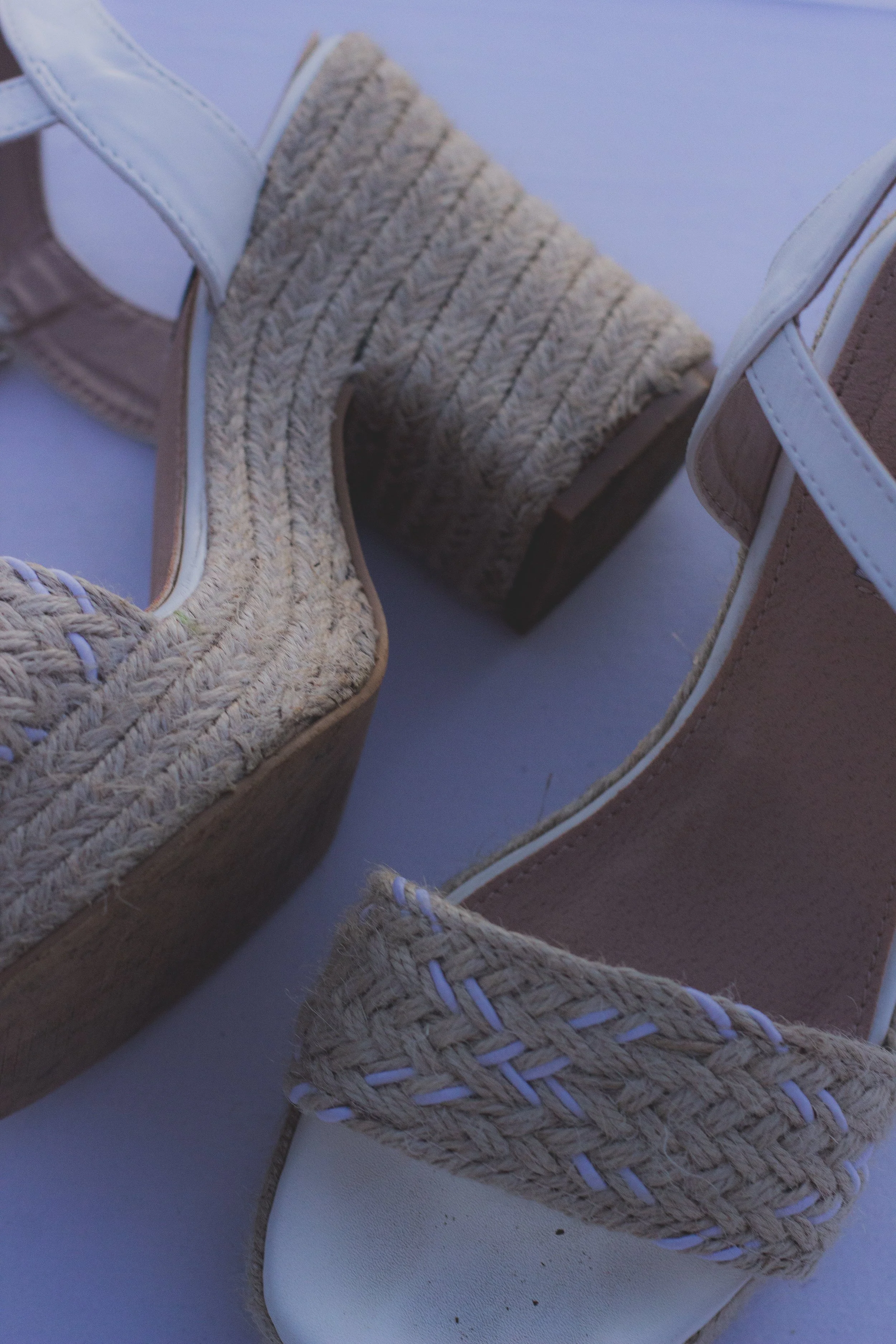 Close-up of worn high-heeled shoes with woven rope details on the heels and around the soles.